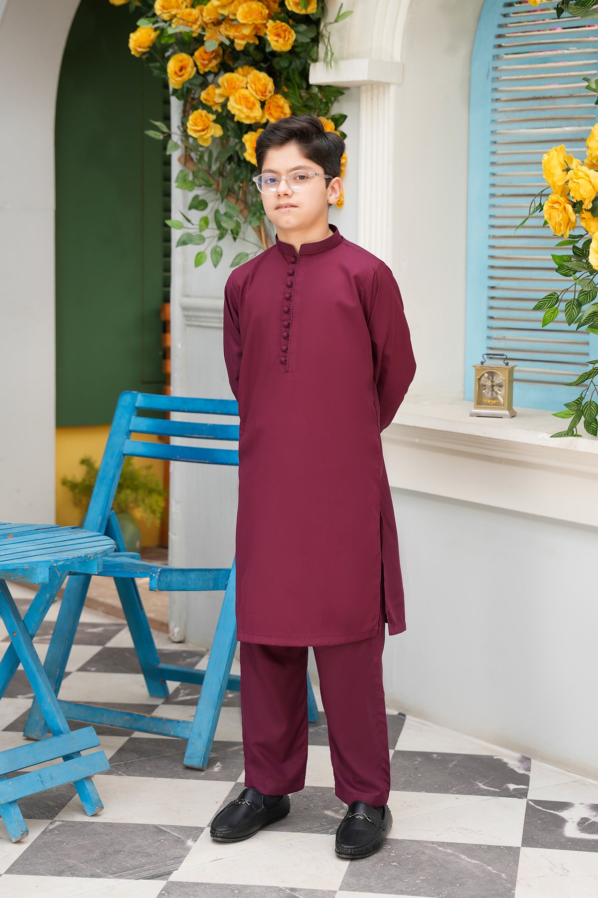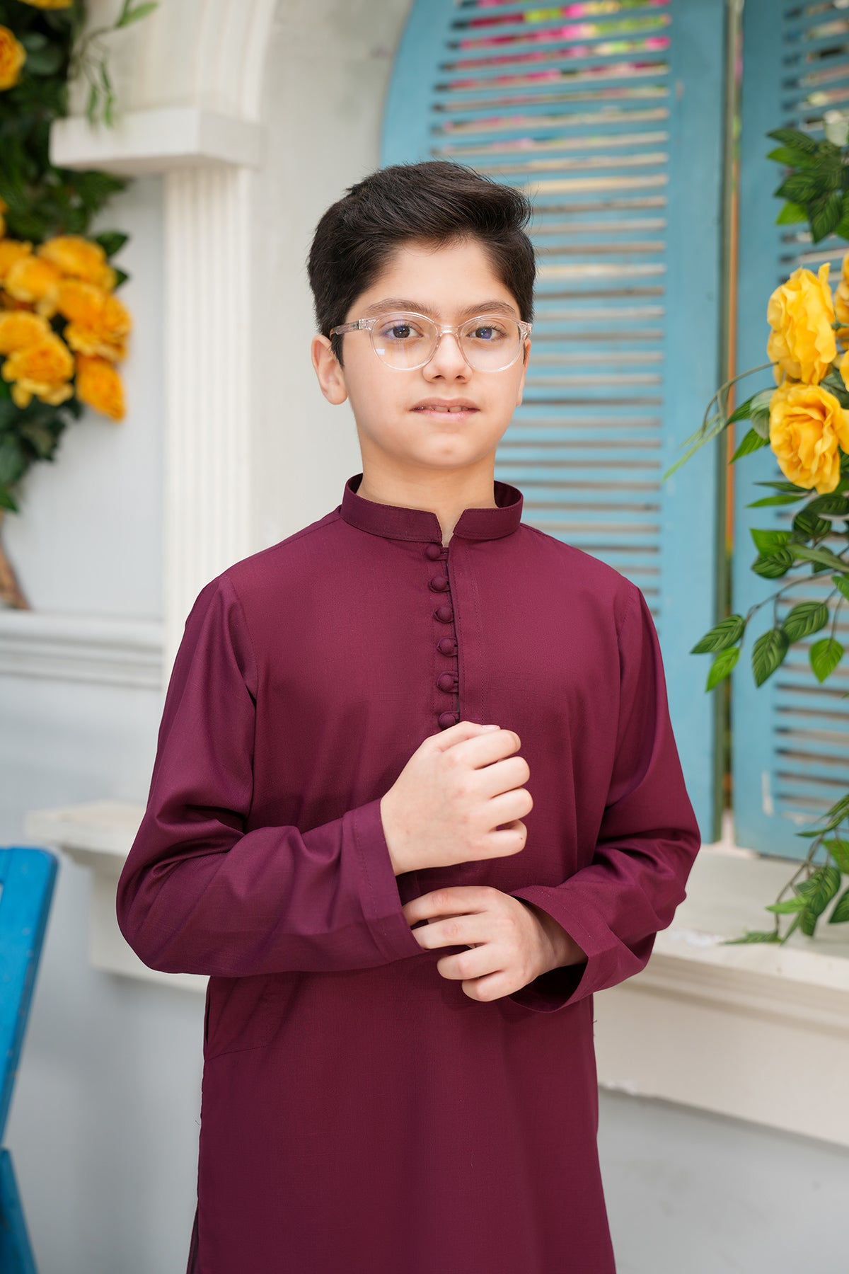 Define sophistication for your young one with the Sharyar ensemble. This deep plum/maroon set is designed for the boy who appreciates a clean, sharp look. Eschewing heavy embroidery for refined structural details, this suit is a versatile powerhouse for everything from school events to festive dinners.