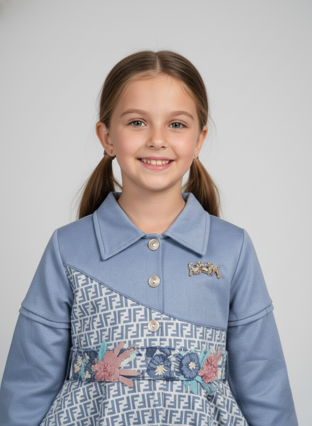 • Mixed Panel Design: Solid blue long sleeves and part of the bodice, combined with a repeating monogram/logo pattern on the skirt and bodice panel.