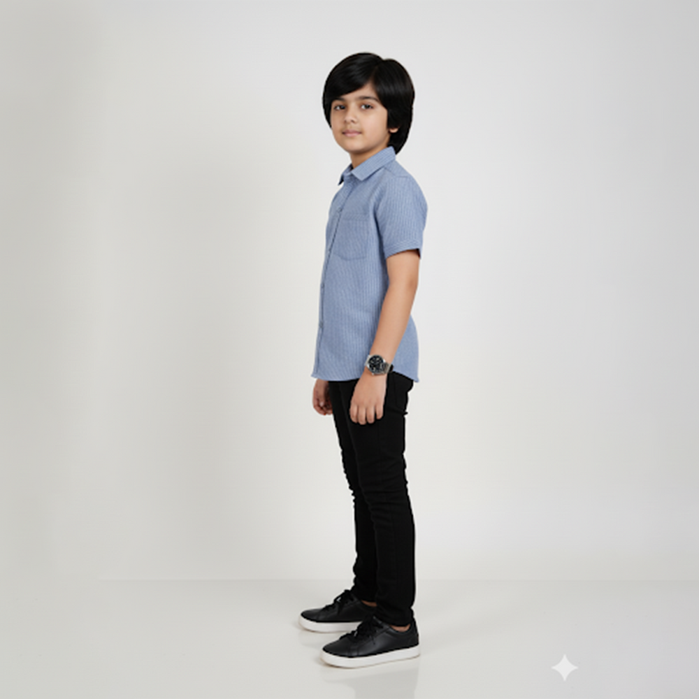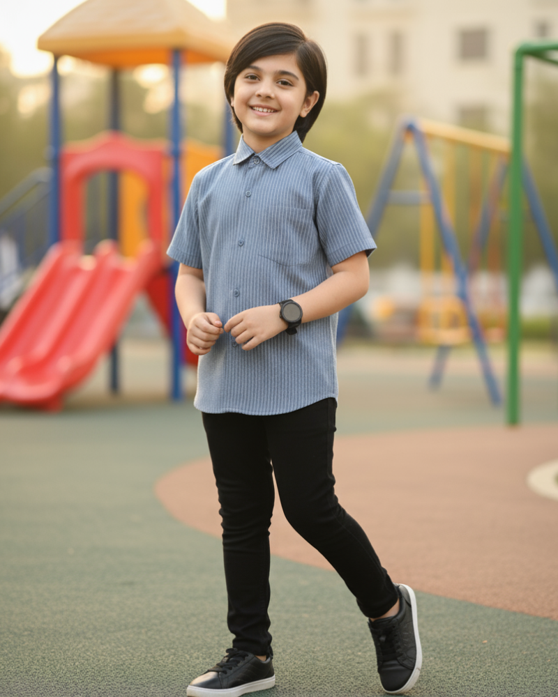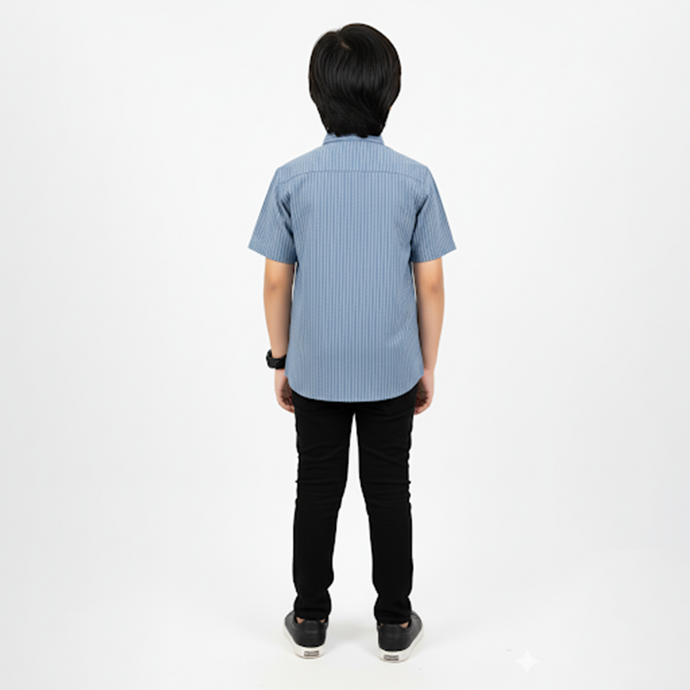 xClassic Front Button Closure, Pointed Collar, Chest Pocket, Rounded Hem, Vertical Pinstripe Design