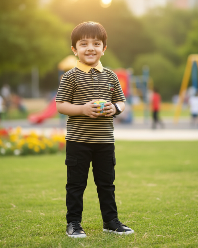 xClassic short-sleeved polo shirt with a structured yellow collar, three-button placket, and all-over horizontal stripes in alternating yellow and navy. Features a small embroidered detail on the chest for added charm.